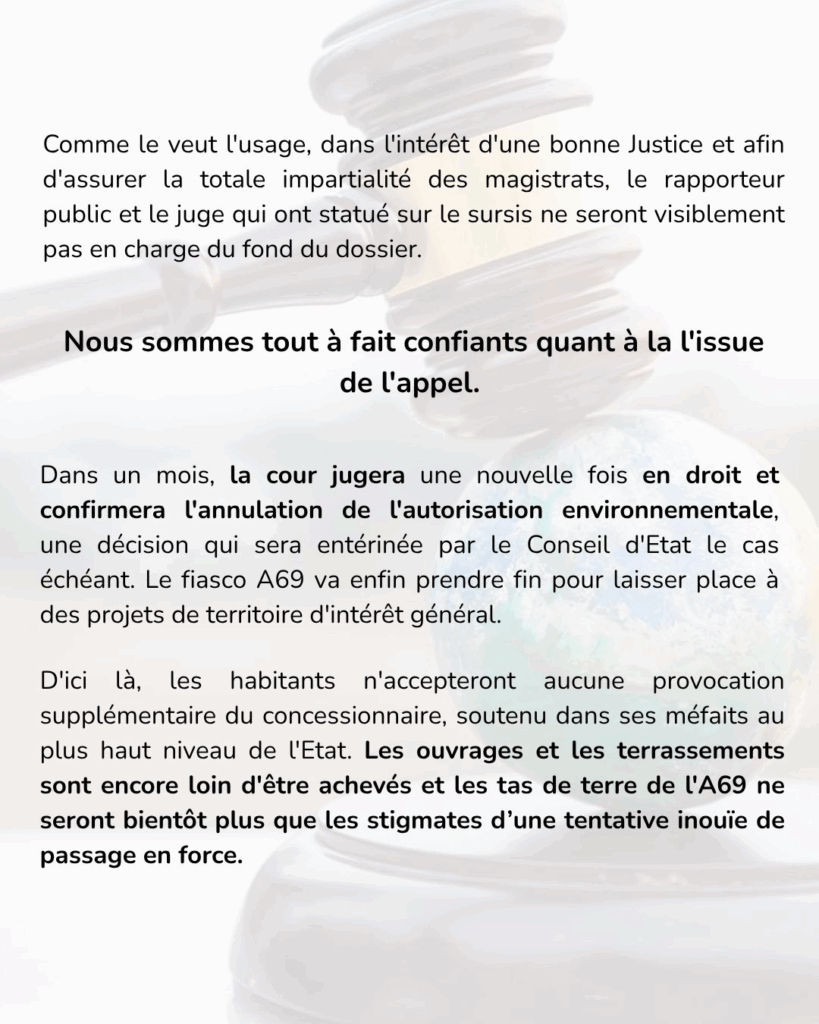 Pour une bonne justice, la Cour d’appel a annoncé que les juges et le rapporteur, qui se prononceront sur le fond du dossier, seront différents de ceux qui ont traité le sursis à exécution en mai, autorisant la reprise du chantier.