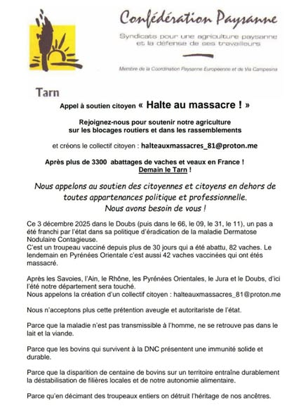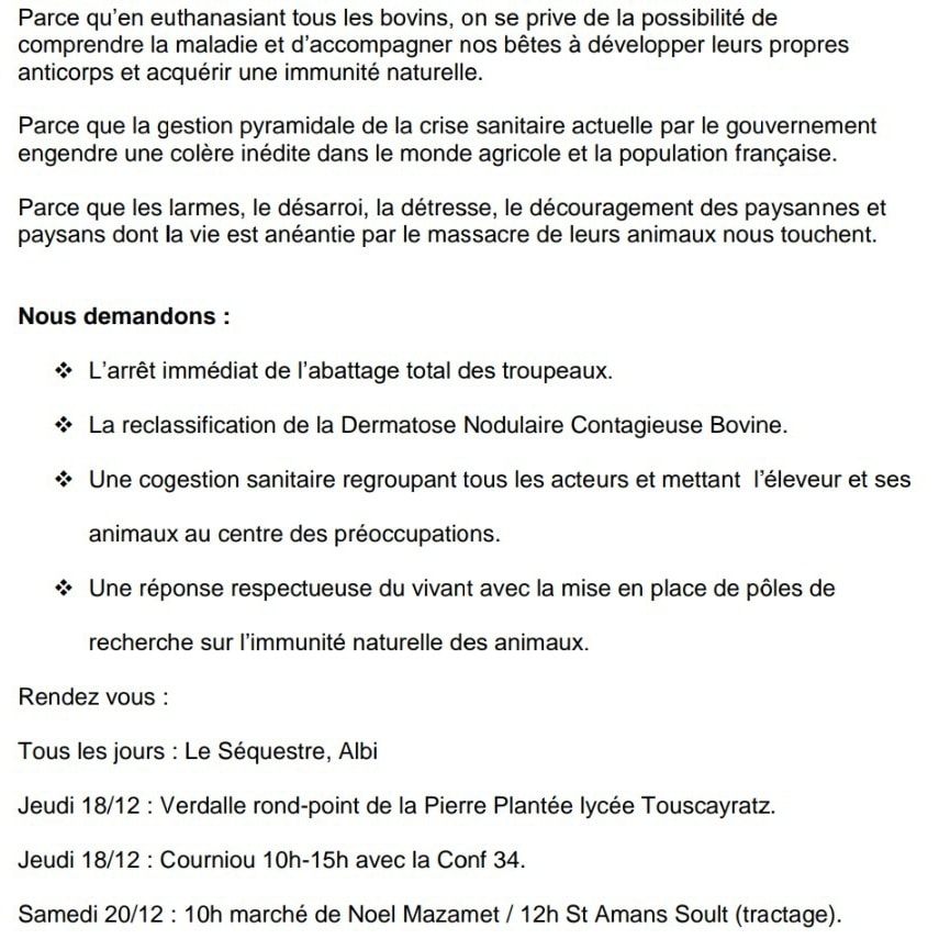 Vous trouverez ci joint le nouveau tract appelant à nous rejoindre sur les lieux de contestation de l’abattage total des troupeaux pour DNC :