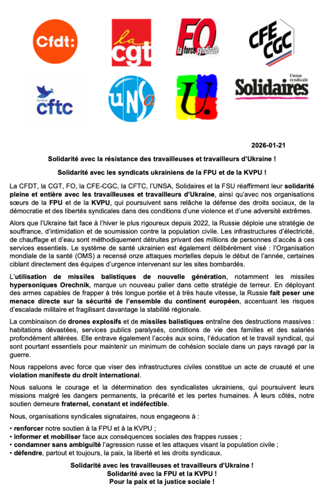 Solidarité syndicale avec les travailleurs/euses d’Ukraine ! 23 janvier 2026 par admin Pour nous contacter dans le TARN : Solidarité Ukraine 81 ukrainesolidarite81@proton.me Dominique 06 63 68 22 86 & Jean 06 72 07 16 74 Follow